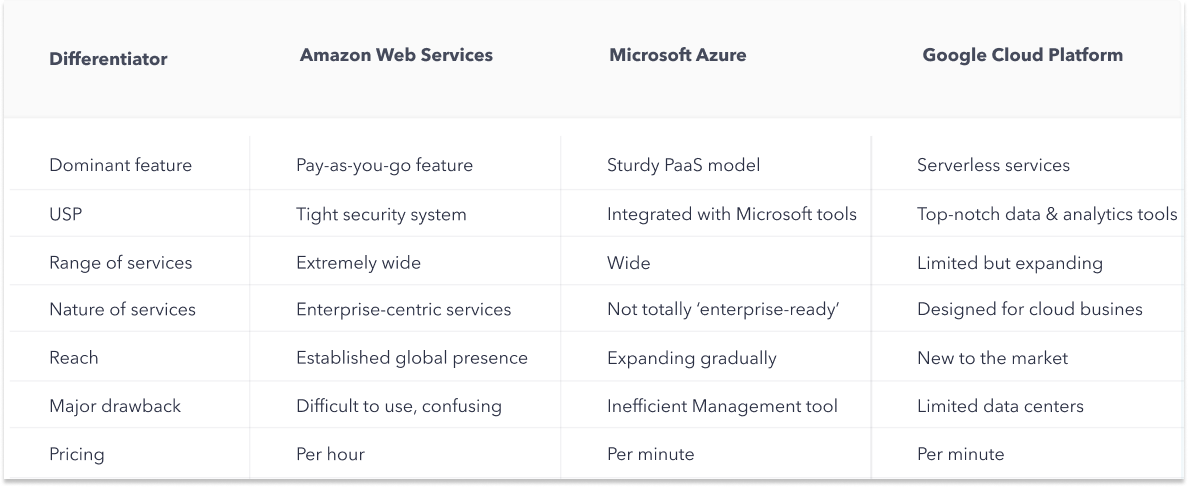 Through an analysis of the key differentiators between these CSPs, we have attempted to bring out the pros and cons of using each of these cloud platforms, with the purpose of enabling you to pick the one that is optimum for your requirements.